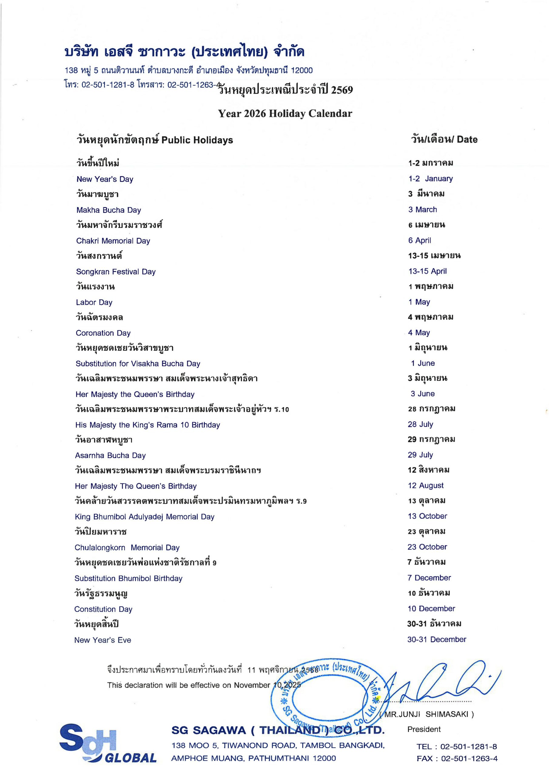 Holiday Calendar of 2026